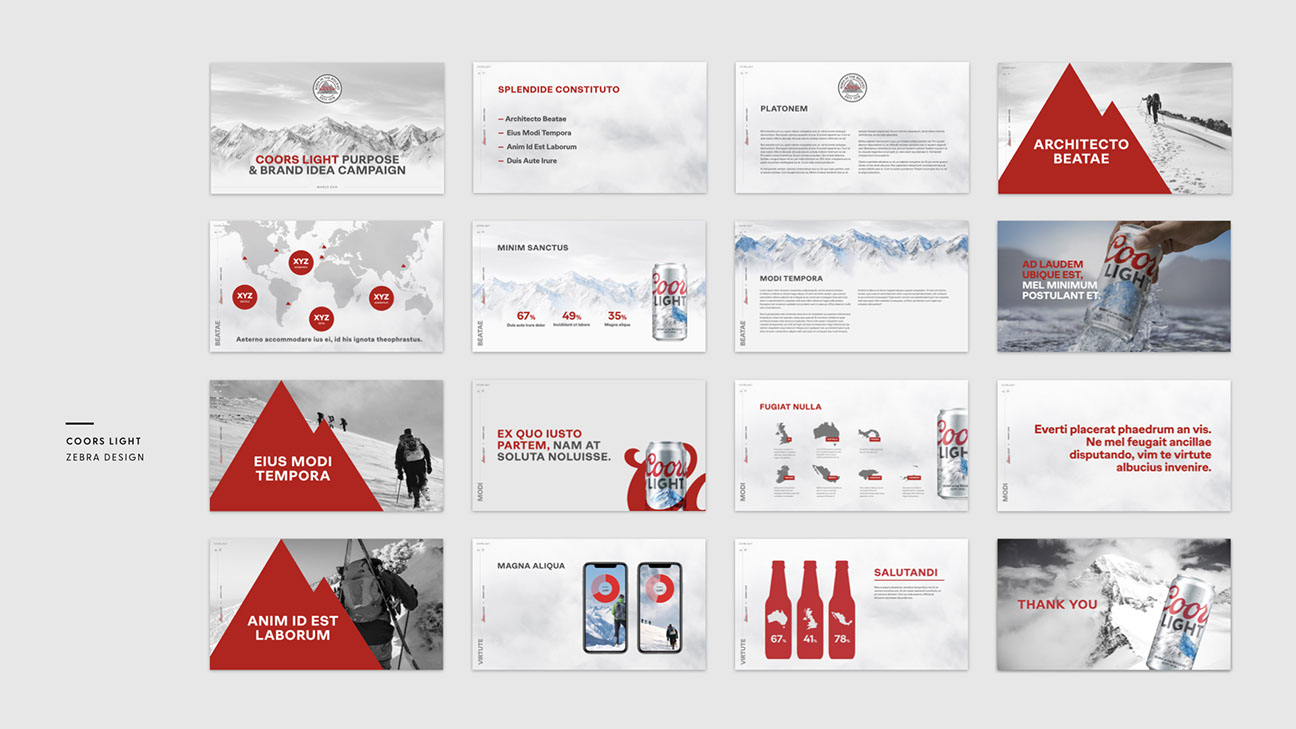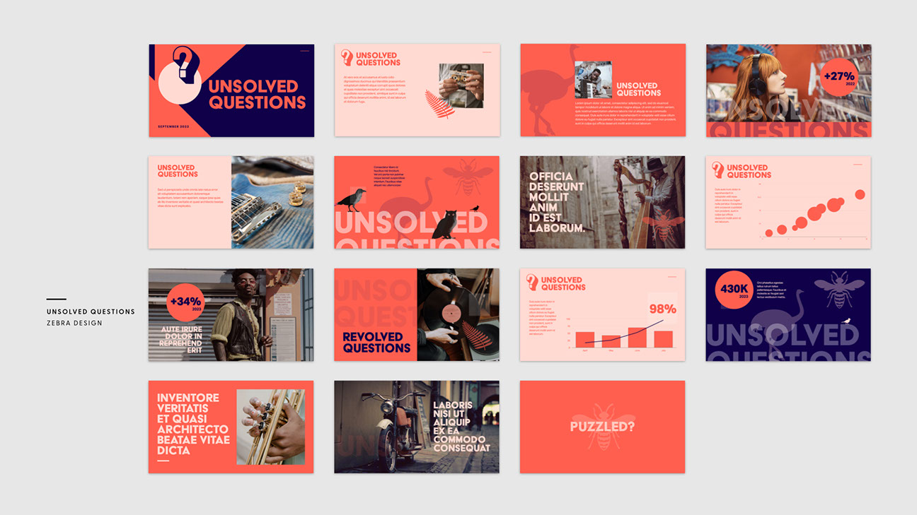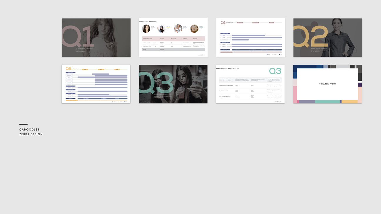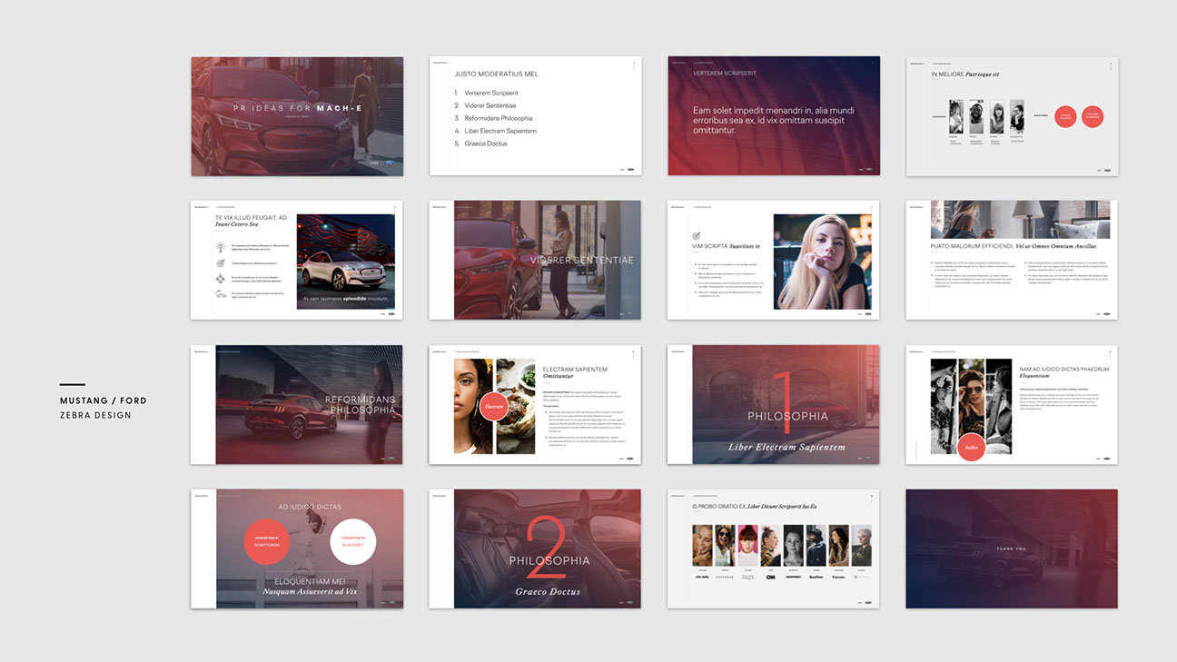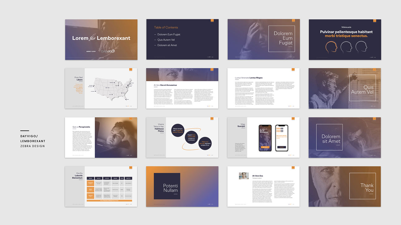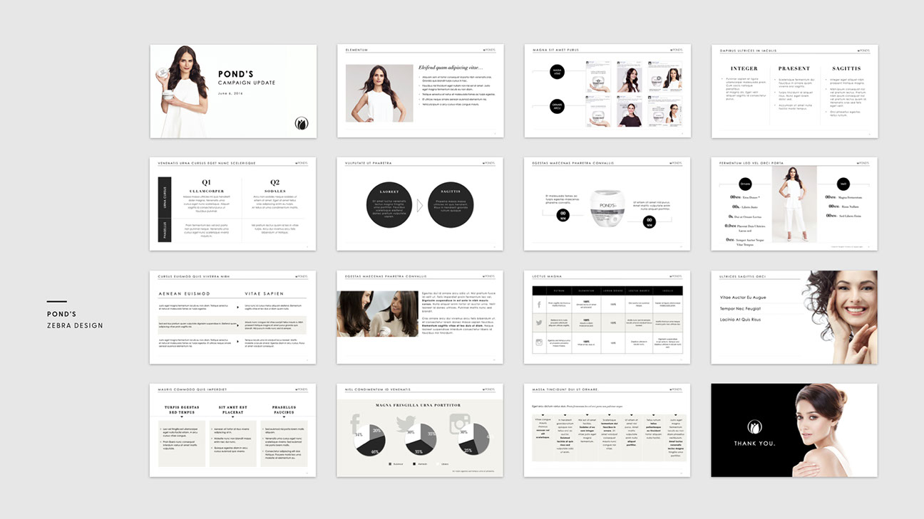 Working for the New York City advertising industry since 2014, Zebra's portfolio includes clients in entertainment, fashion, technology, automotive, finance, pharmaceutical, transportation, retail, cosmetics, and food industries. From pitch decks created from scratch to adapting content into existing templates,